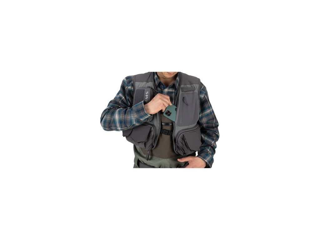 a tkanou bezpečnou kapsu na telefon v horní části hrudi - Dvě velké horizontální spodní kapsy, čtyři klopové kapsy na suchý zip a velká kapsa na zip
